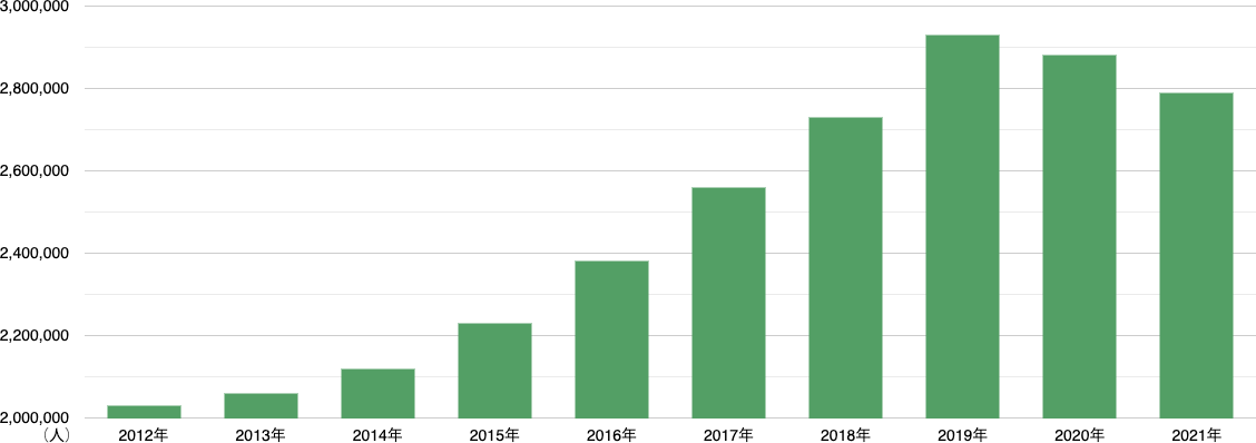 新型コロナウイルスの感染拡大に伴う海外からの入国規制により、2019年をピークに在留外国人数は減少に転じましたが、足元では入国規制の緩和に伴い、1ヶ月の訪日者数が16万人ほどまで回復しています。